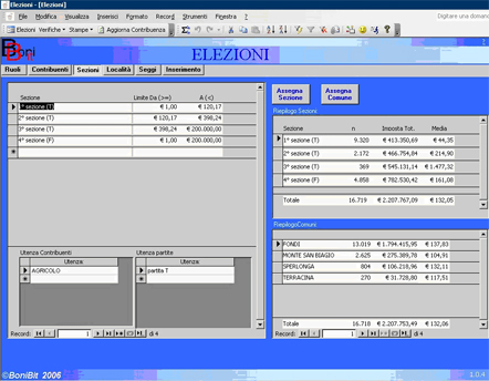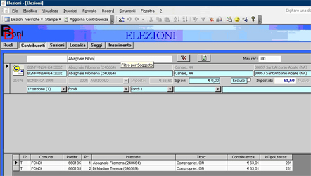 Stampe – [ELENCO CONTRIBUENTI ELETTORI] elenco dei contribuenti in ordine di comparto immobiliare (terreni e fabbricati) e, nell’ambito di questi in ordine alfabetico, con le partite catastali e gli intestati collegati (in questo elenco non c’è raggruppamento quindi lo stesso soggetto può comparire più volte, non sono riportati sezione e seggio); [ELENCO ELETTORI PER COMUNE] elenco provvisorio degli aventi diritto al voto in ordine di Comune e, nell’ambito di questi, in ordine alfabetico (in questo elenco che serve per la pubblicazione presso i Comuni c’è raggruppamento per CF quindi lo stesso soggetto può comparire una sola volta, sono riportati sezione e seggio); [ELENCO ELETTORI PER COMUNE E SEZIONE] elenco provvisorio degli aventi diritto al voto in ordine di Comune e, nell’ambito di questi, in ordine di Sezione e quindi in ordine alfabetico; [ELENCO ELETTORI PER SEZIONE] elenco provvisorio degli aventi diritto al voto in ordine di Sezione e, nell’ambito di questi, in ordine alfabetico (in questo elenco c’è raggruppamento per CF quindi lo stesso soggetto può comparire una sola volta); [ELENCO ELETTORI PER SEGGIO] elenco definitivo degli aventi diritto al voto in ordine di Seggio e, nell’ambito di questi, in ordine alfabetico (in questo elenco che serve per lo svolgimento delle operazioni elettorali c’è raggruppamento per CF quindi lo stesso soggetto può comparire una sola volta, l’impaginazione è organizzata in orizzontale e contiene lo spazio per la firma da parte degli elettori); [AVVISI ELETTORALI] consente di stampare lomunicazioni elettorali da inviare agli aventi diritto (dato l’elevato numero di lettere è consigliabile l’nvio tramite Postel); [RIEPILOGO SEGGI] dati riepilogativi dei seggi con dettaglio delle sezioni (limiti alfabetici, imposta e numero dei votanti); [RIEPILOGO SEZIONI] dati riepilogativi delle sezioni con dettaglio dei seggi ((limiti delle Fasce, imposta e numero dei votanti).